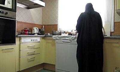 Risky fap off while watching big ass hijab step-mother in the kitchen.
