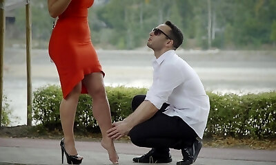 Sex-positive blonde woman in red shoes with high heels found a proper guy to worship her
